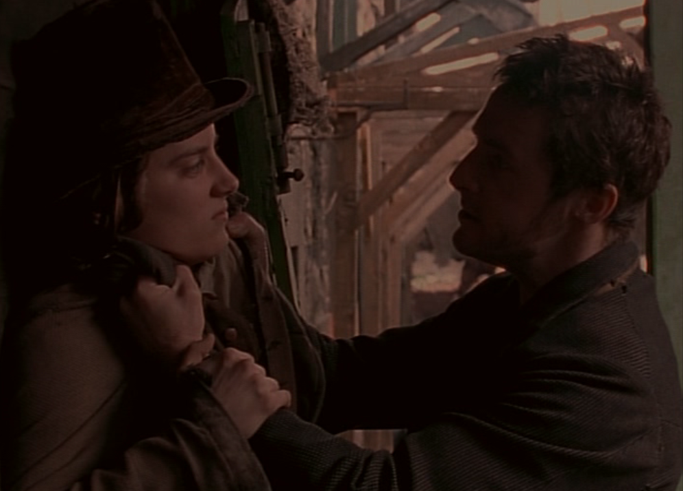 Played by David O'Hara, Sikes is always the same. Sometimes he's more terrifying, sometimes less, but always a brute, and here he's threatening the Dodger's life so he'll give up the truth that Nancy is helping Oliver escape back to the Brownlow family who had taken him in.